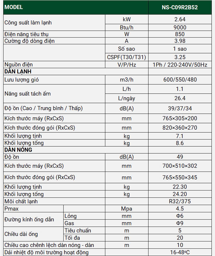 Thông số kỹ thuật Điều hòa Nagakawa 24000BTU 1 chiều NS-C24R2B52:
